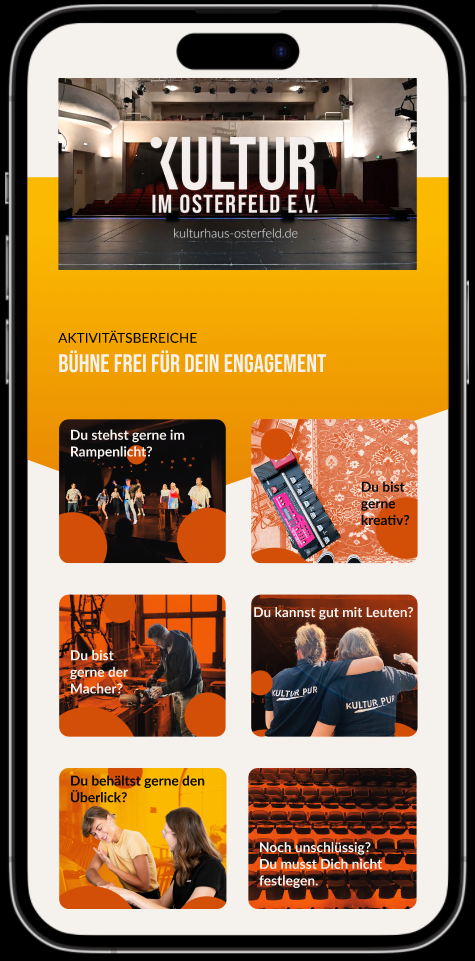 Das Kulturhaus Osterfeld in Pforzheim ist ein wichtiger Verein für Kulturaufführungen, der von Theater über Konzerte bis hin zu Stand-Up-Comedy ein vielfältiges Programm bietet. Um den Fortbestand des Kulturhauses zu sichern, ist es entscheidend, Menschen für die Übernahme von Ehrenämtern zu begeistern. Das Kulturhaus Osterfeld steht vor der Herausforderung, neue Ehrenamtliche zu gewinnen, um sein vielfältiges Angebot aufrechterhalten zu können. Im Rahmen eines Hochschulprojekts habe ich gemeinsam mit einem Team an der Entwicklung einer neuen Kommunikationsstrategie gearbeitet, um das Ehrenamt im Kulturhaus Osterfeld attraktiv zu bewerben. Im Rahmen des Projekts haben wir eine Landingpage von Grund auf neu konzipiert und entwickelt, um auf informative, ansprechende und zielgerichtete Weise über die Möglichkeiten des Ehrenamts im Kulturhaus Osterfeld zu informieren. Die Landingpage soll es Nutzern ermöglichen, sich umfassend über die verschiedenen Aufgabenbereiche und Vorteile des Ehrenamts zu informieren und im besten Fall direkt mit dem Kulturhaus in Kontakt zu treten.